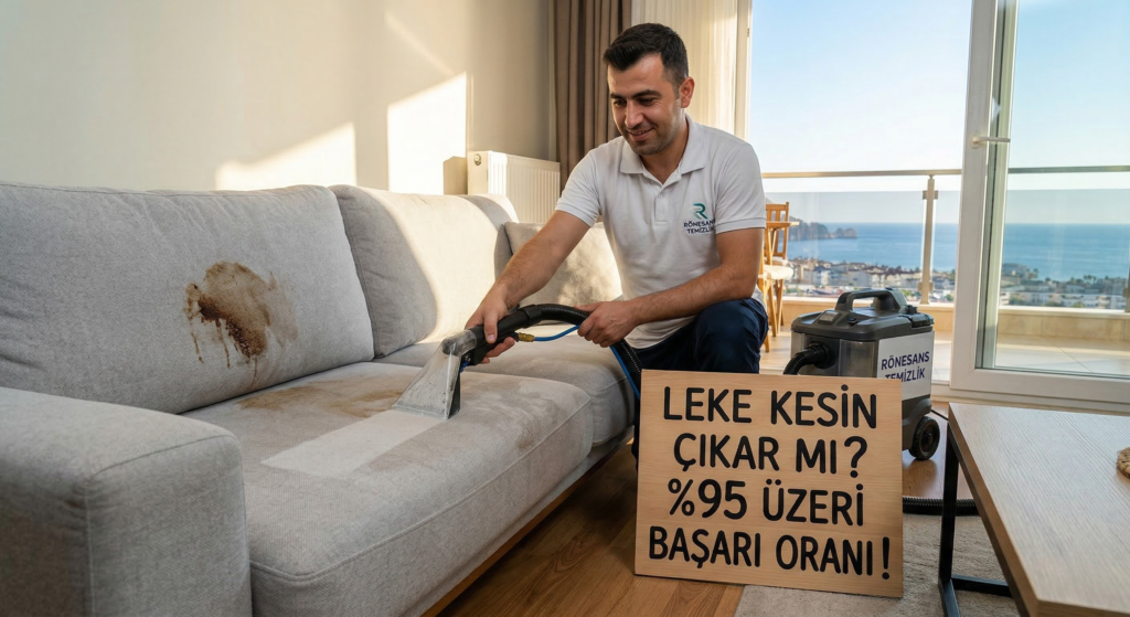 Cevap: Rönesans Temizlik olarak profesyonel leke çıkarıcılar kullanıyoruz. Çay, kahve gibi taze lekelerde başarı oranımız %95 üzerindedir. Ancak kumaşın yapısına işlemiş veya daha önce yanlış kimyasallarla (çamaşır suyu vb.) silinmiş eski lekelerde kumaşın dokusuna zarar vermeden maksimum temizliği hedefliyoruz.
